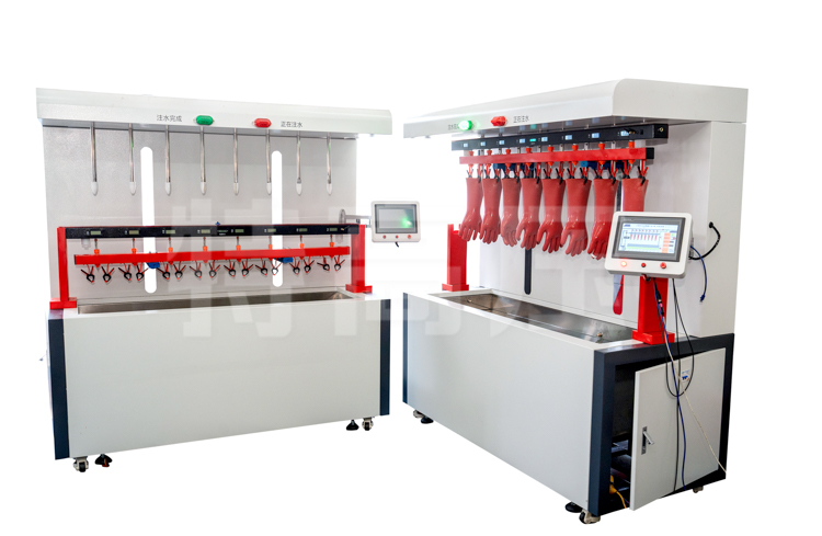 - 2、絕緣手套試驗(yàn)時(shí),注水采用全自動(dòng)注水方式,試驗(yàn)人員只需按要求安裝好手套,在注水裝置的設(shè)置界面中選擇絕緣手套的級(jí)別后,注水裝置依據(jù)《DL/T1476-2015電力安全工器具預(yù)防性試驗(yàn)規(guī)程》、《GB/T17622-2008帶電作業(yè)絕緣手套》等自動(dòng)設(shè)定手套袖口到水面的距離后注水,待水套注水完成后,注水裝置向水槽內(nèi)注水,最終保證手套內(nèi)外水面一致。
