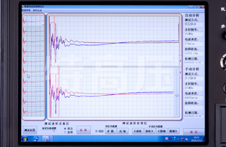 - 4、軟件實(shí)現(xiàn)低壓脈沖、多次脈沖法全自動識別搜索,波形故障拐點(diǎn)自動卡位,故障距離儀器自動讀取并顯示,,同屏三區(qū)顯示波形, 同屏隨機(jī)顯示十個低壓脈沖波形供選擇,同時實(shí)現(xiàn)自動和人為處理兩種模式 ,使得對波形實(shí)現(xiàn)雙重卡位操作,雙游標(biāo)移動可精確到0.15米,提高粗測精度,減少波形誤差。